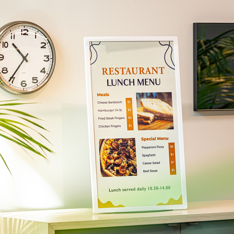 Easel Sheet ei tarvitse johtoja ja on erittäin kevyt. Tämä mahdollistaa sen sijoittamisen lähes mihin tahansa myymälässä, aivan kuten perinteiset painetut julisteet.