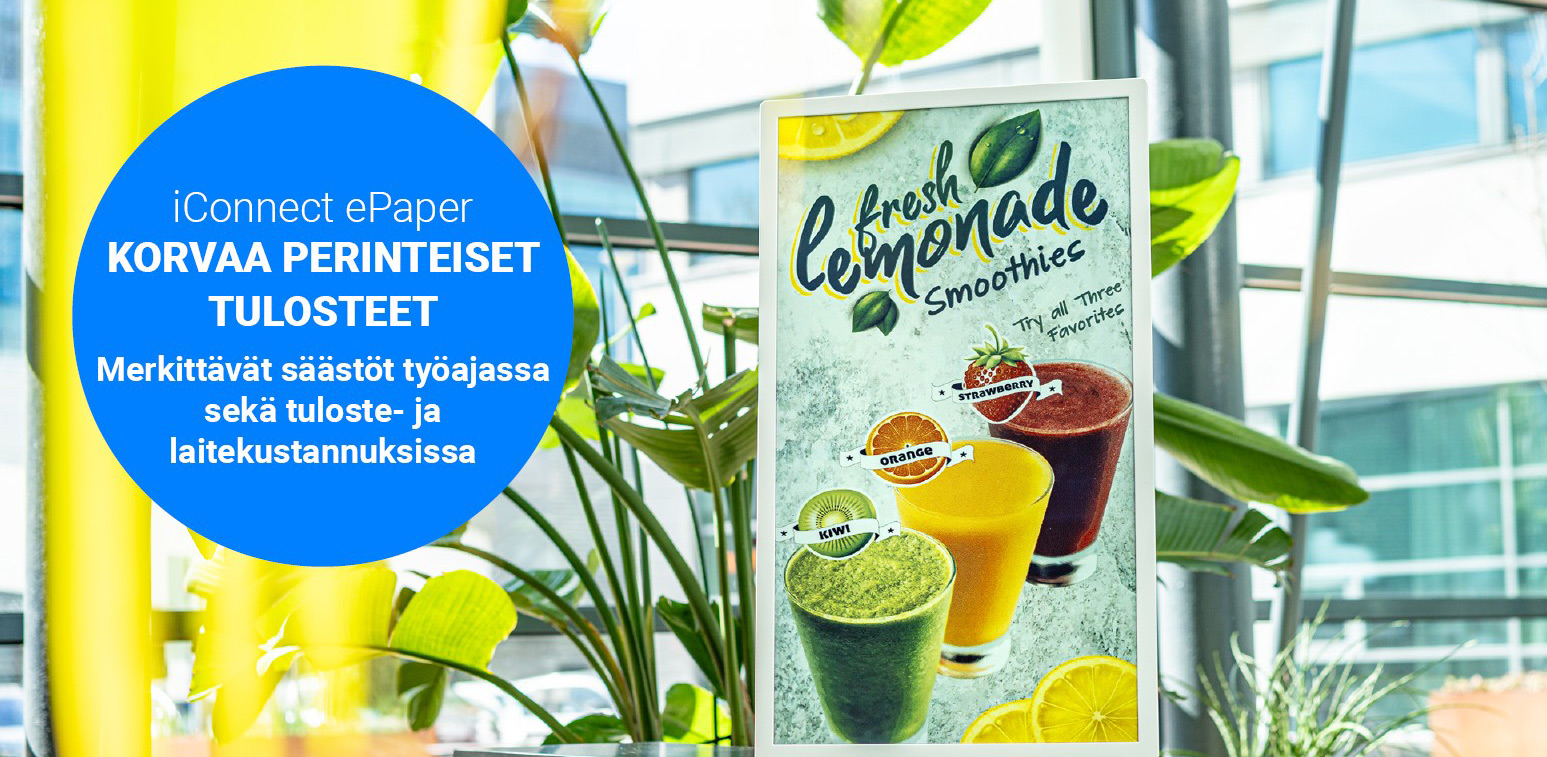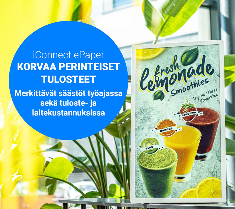 iConnect ePaper on innovaatio parhaimmillaan ja erinomainen korvike painotuotteille tai vaihtoehto myös Digital Signage näytöille tapauskohtaisesti.